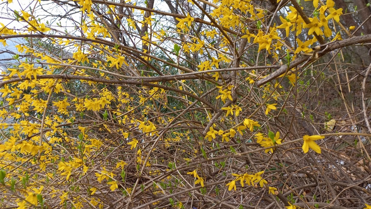 마을 뒷산 둘레 길을 돌면서 휴대폰에 오솔길의 봄의 전령 개나리