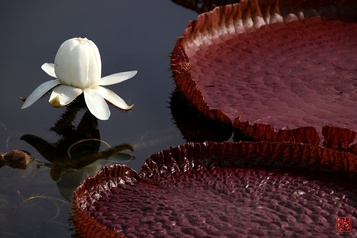 빅토리아연꽃은 첫 날은 하얀색으로 그리고 꽃잎을 떨구고(시듦)다시 연분홍 빛으로 꽃을 피워 대관식을 거쳐
