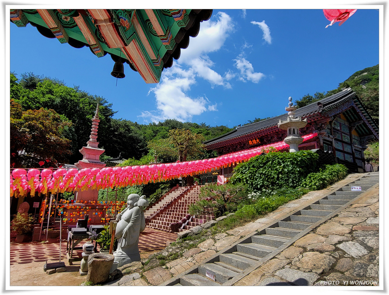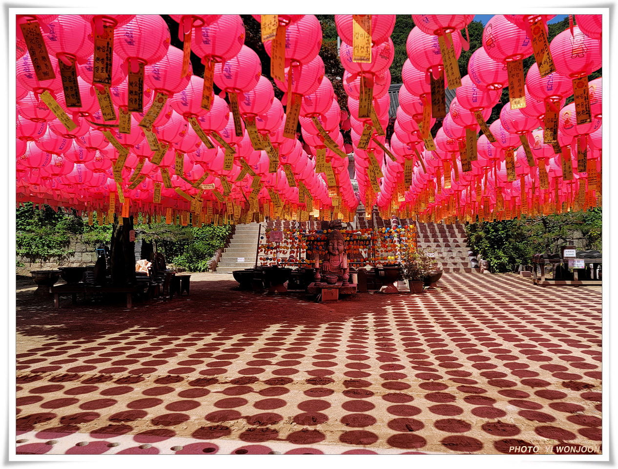 마애불도 보이고, 연등의 색감이 화려한 모습입니다.