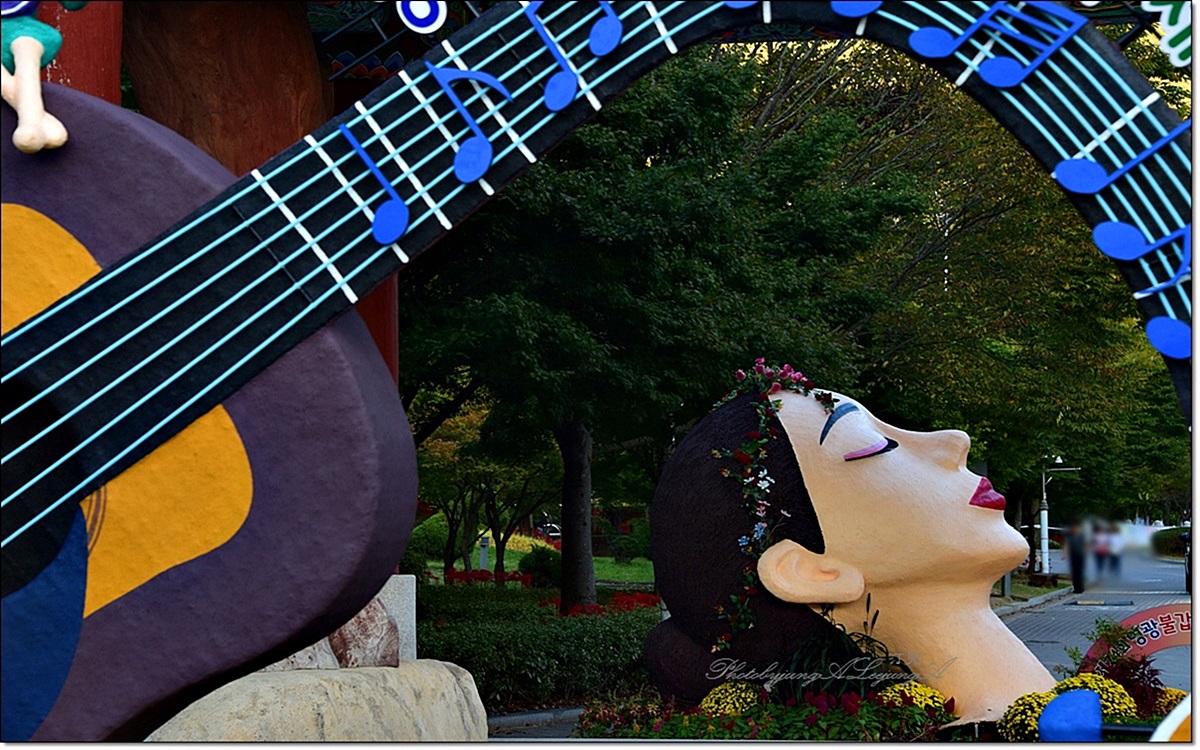 사찰에 기타나 여자얼굴 설치물이 잘 매치가 되질 않아 보입니다...