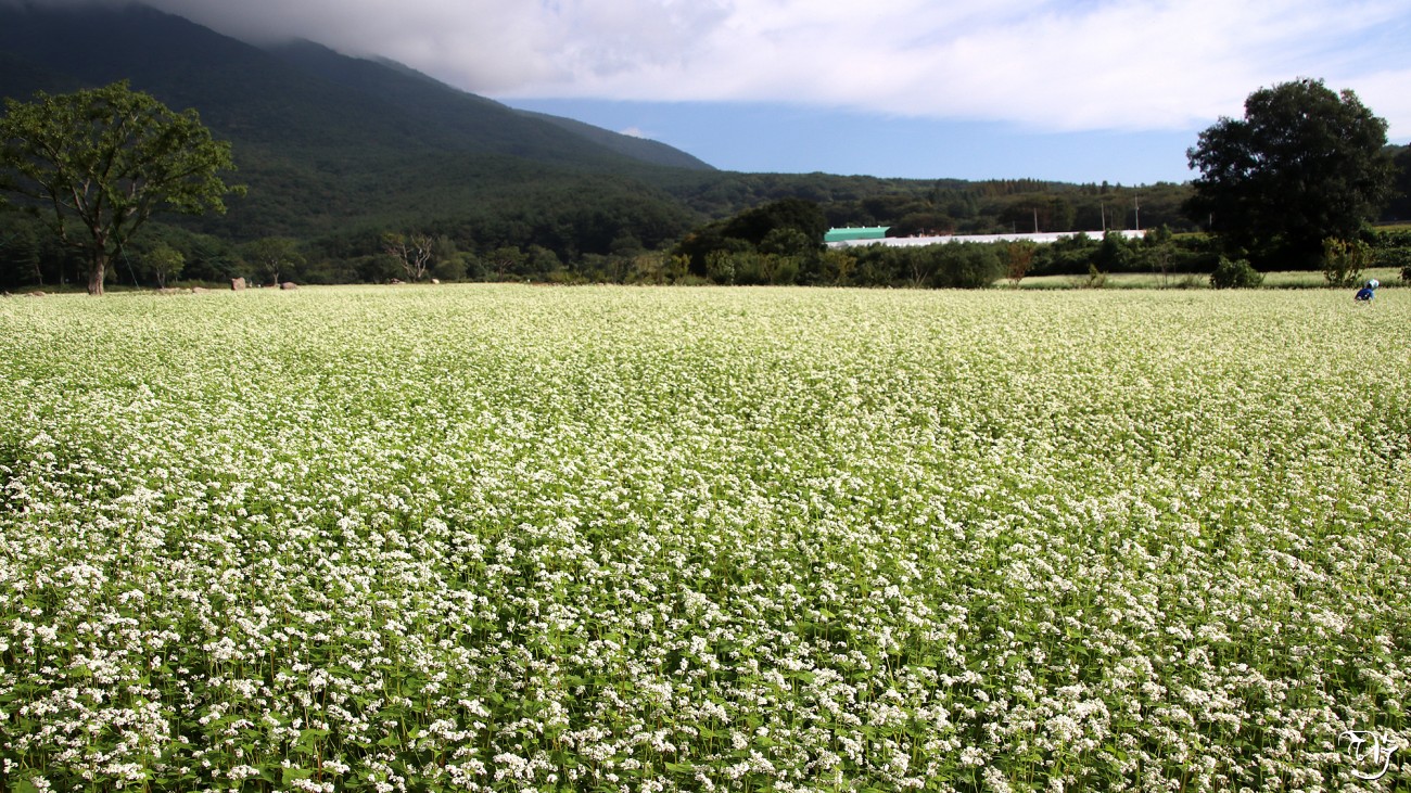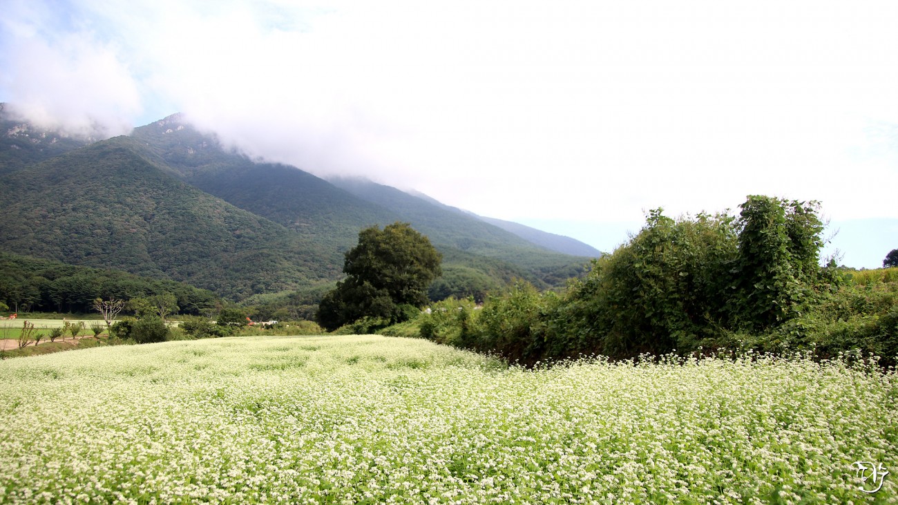메밀꽃 뒤로 보이는 산과 구름도 예술이네요