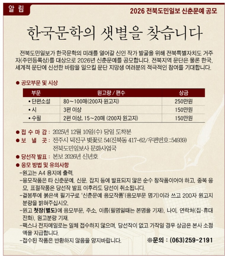 전북도민일보가 한국문학의 미래를 열어갈 신인 작가 발굴을 위해 전북특별자치도 거주자(주민등록상)를 대상으로 ‘2026년 신춘문예’를 공모합니다.