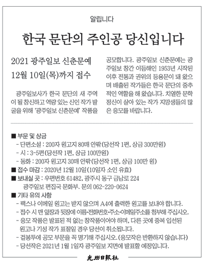2021년 <광주일보> 신춘문예 공모 (12/10) 페이지 정보 작성자 시마을 쪽지보내기 메일보내기 홈페이지 자기소개 아이디로 검색 전체게시물 쪽지보내기 메일보내기 홈페이지 자기소개 아이디로 검색 전체게시물 댓글 0건 조회 870회 작성일 20-11-06 15:38 본문 . 목록 댓글목록 댓글목록 등록된 댓글이 없습니다.