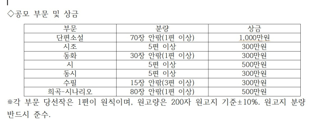 - 원고 첫 장에 별도로 응모 부문과 주소, 본명, 나이, 연락처를 반드시 기입해야 합니다. 특히 나이를 허위로 작성할 경우 불이익이 있을 수 있습니다.