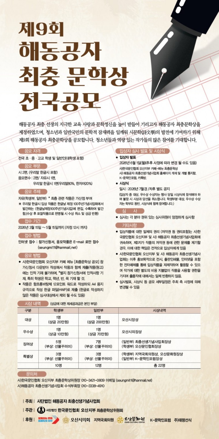 주관 : 사)한국문인협회 오산지부 최충문학상위원회