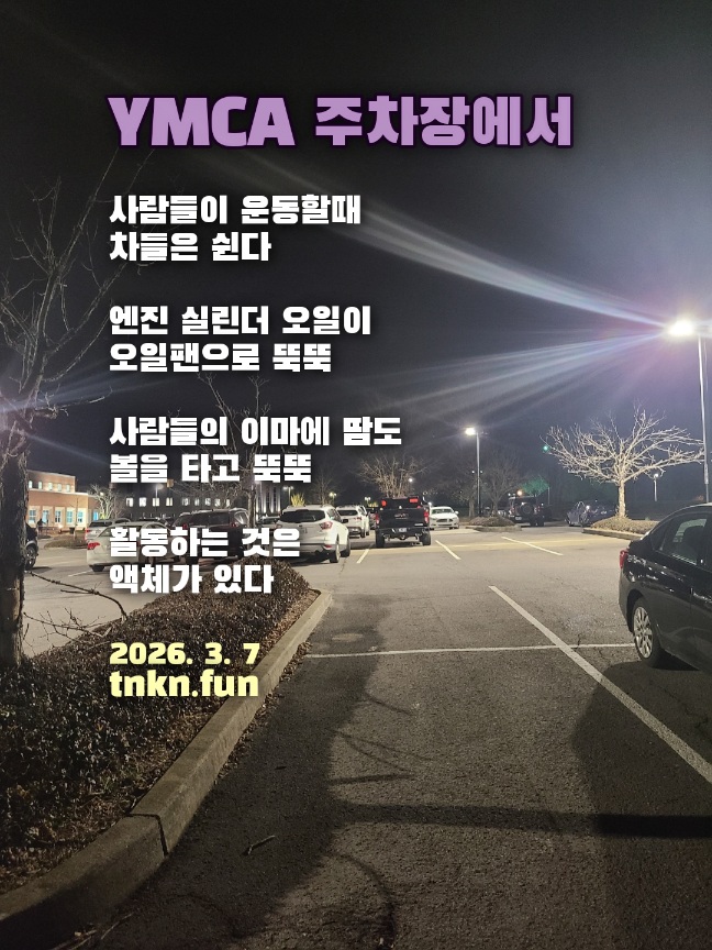 YMCA 주차장에서 페이지 정보 작성자 짭짤한시인 쪽지보내기 메일보내기 홈페이지 자기소개 아이디로 검색 전체게시물 쪽지보내기 메일보내기 홈페이지 자기소개 아이디로 검색 전체게시물 댓글 0건 조회 179회 작성일 26-03-08 00:06 본문 Tennessee Korean Network 짭짤한시인의 책방 아마존 서재 목록 댓글목록 댓글목록 등록된 댓글이 없습니다.