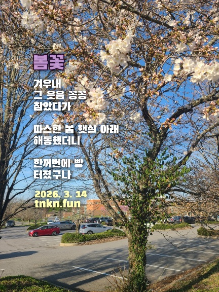 봄꽃 페이지 정보 작성자 짭짤한시인 쪽지보내기 메일보내기 홈페이지 자기소개 아이디로 검색 전체게시물 쪽지보내기 메일보내기 홈페이지 자기소개 아이디로 검색 전체게시물 댓글 0건 조회 247회 작성일 26-03-15 04:22 본문 Tennessee Korean Network 짭짤한시인의 책방 아마존 서재 목록 댓글목록 댓글목록 등록된 댓글이 없습니다.