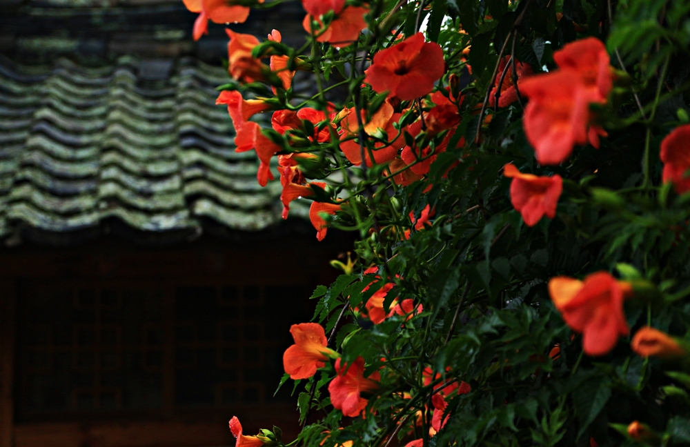 비 개인 뒤의 능소화 빛깔이 진합니다.노을빛같은...