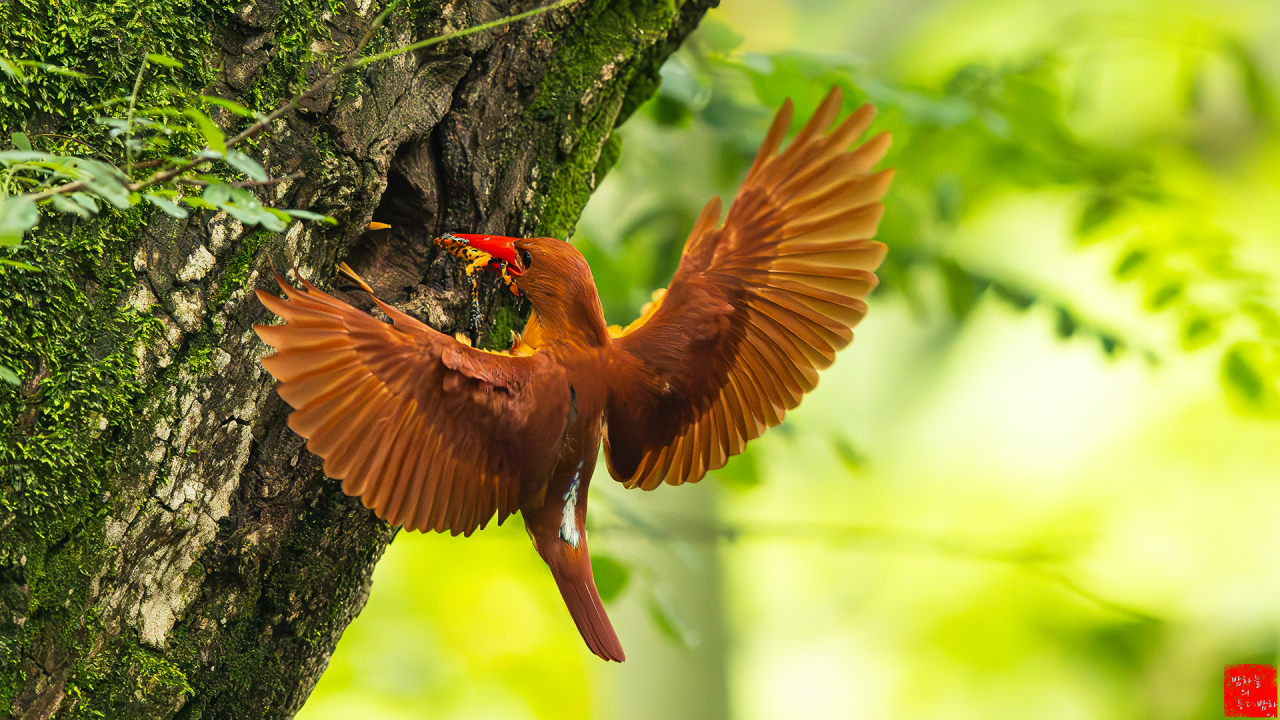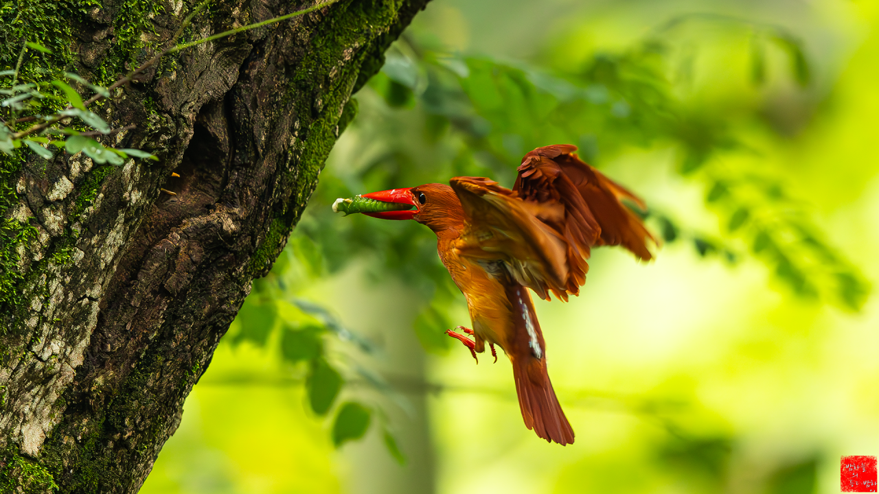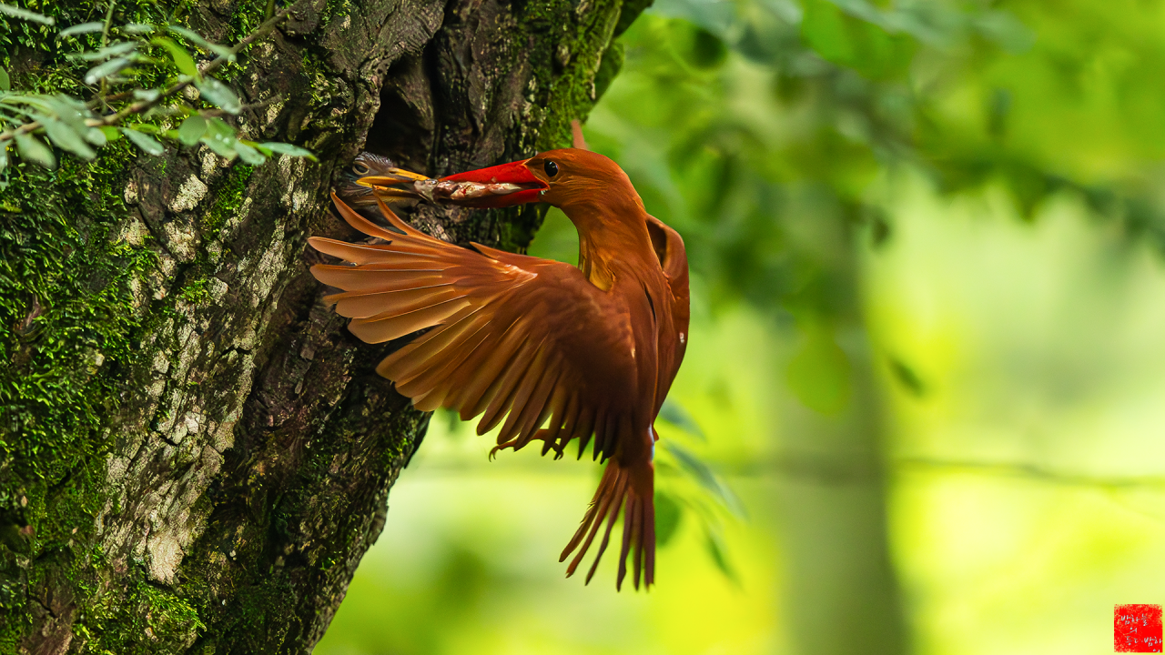 절개지에 둥지를 파서 육추를 하는 청호반새와 달리, 딱따구리가 파놓은 나무 둥지에서
