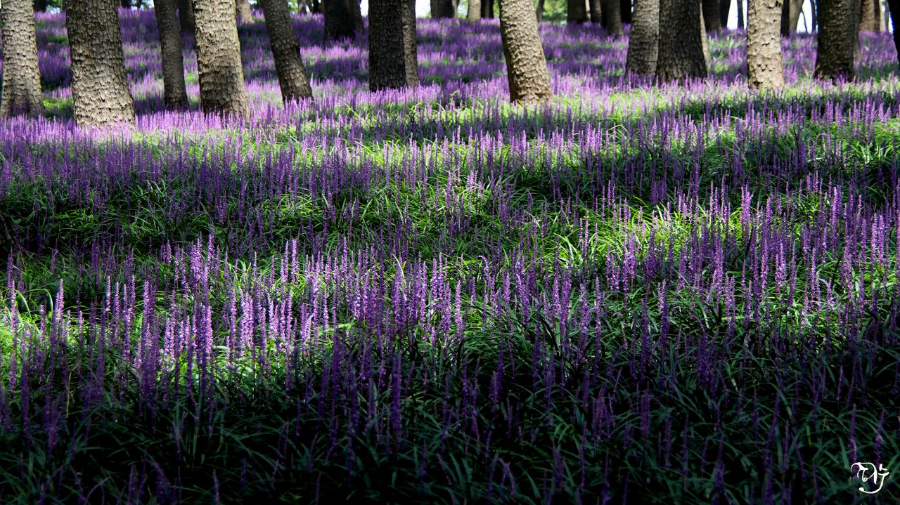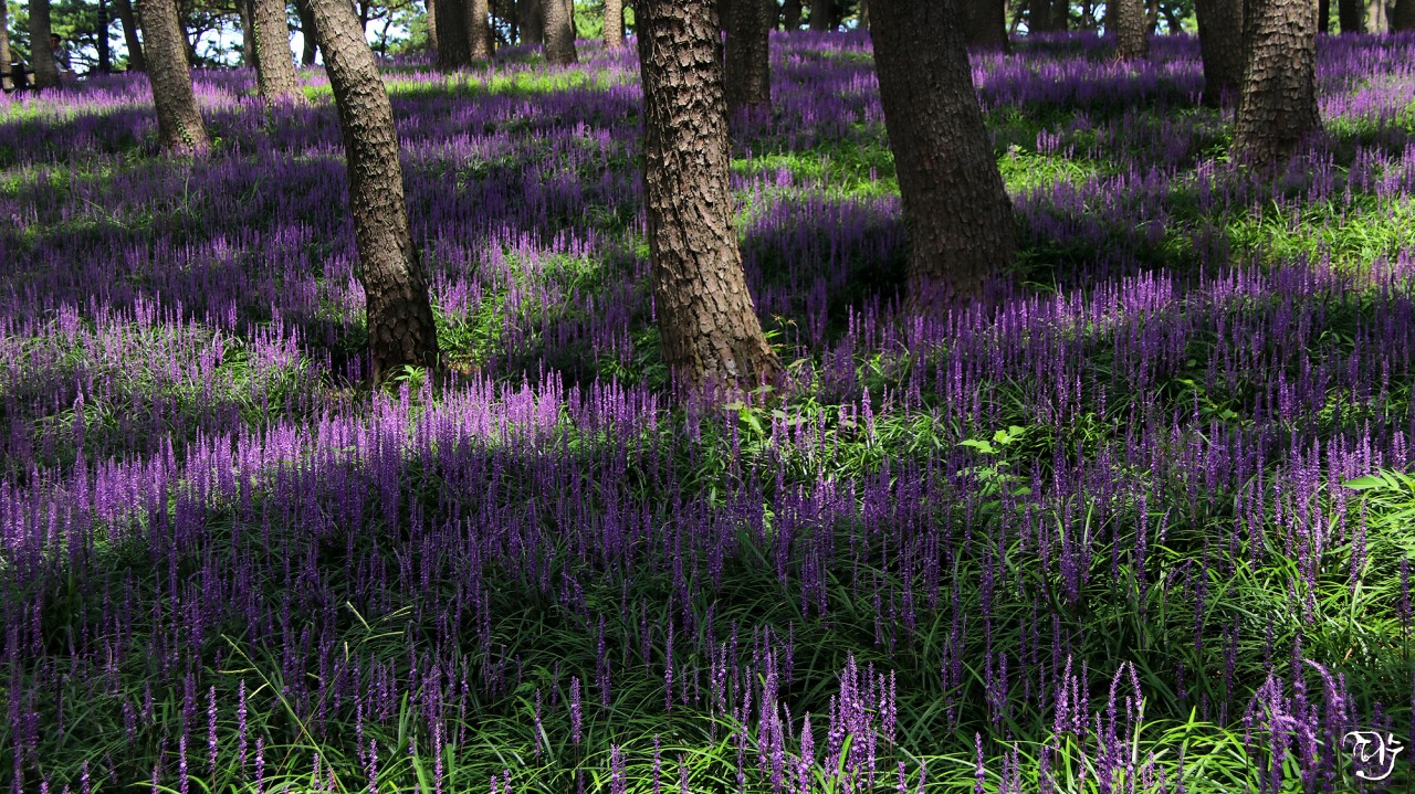 울산 대왕암 솔숲에 서릿발 같은 보라의 맥문동 보기 좋습니다
