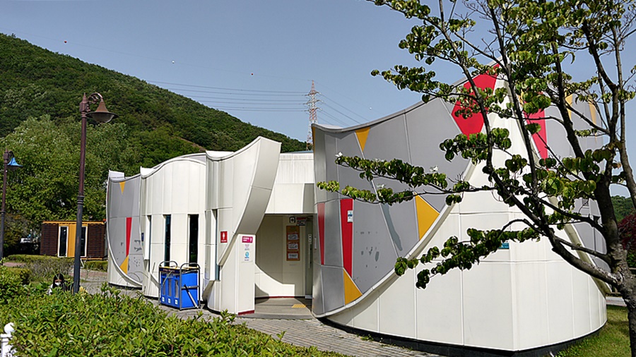 크지는 않으나 아기자기한 분위기의 잔디밭에는 특이한 디자인의 화장실이 있는데요
