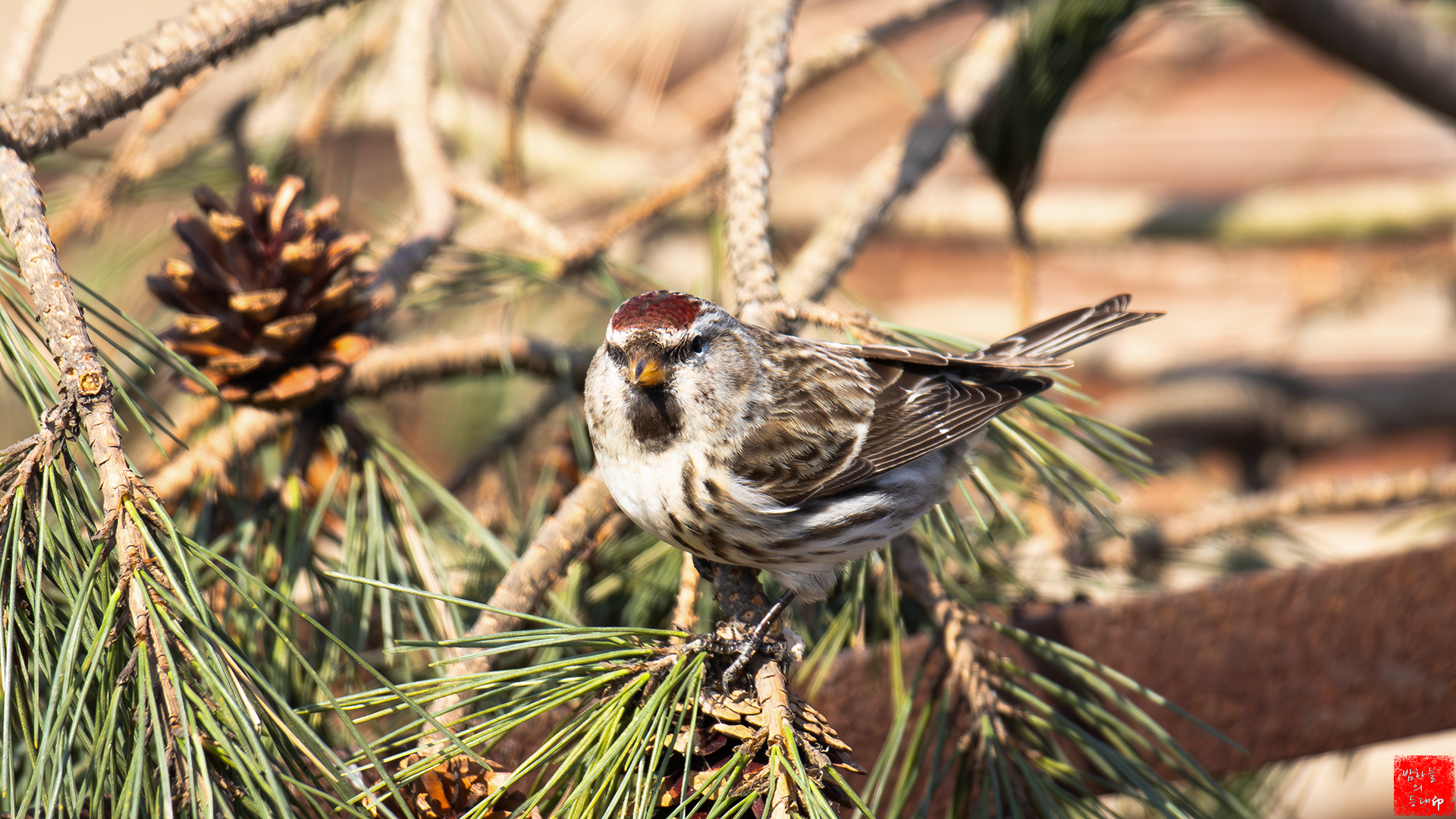 홍방울새 솔방울에 앉아서