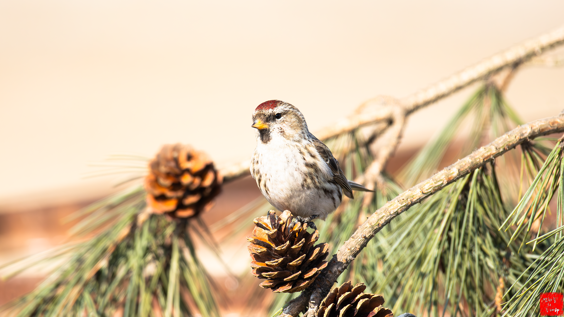 솔방울 위에 앉아있는 홍방울새
