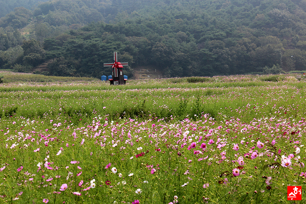 코스모스꽃 활짝피었고 풍차도 기찻길도
