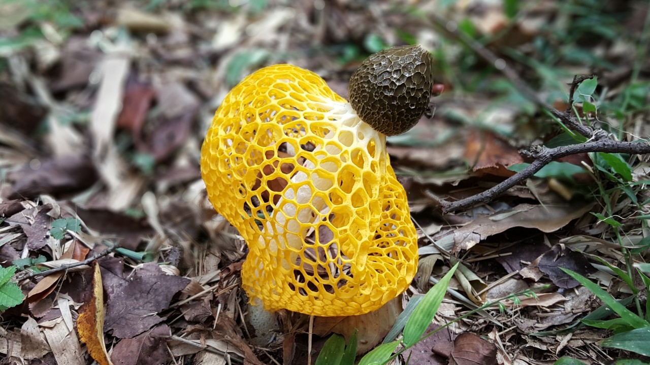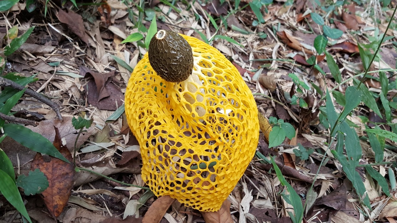 가까이 가보니 흰색 버섯 하나가 금색 그물 망태로 자신의 온몸을 둘러쓰고