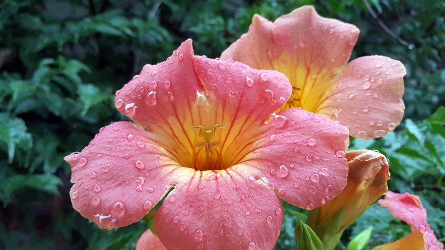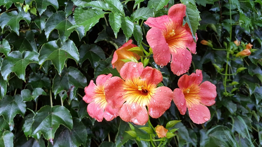 비를 맞은 능소화와 해당화, 협죽도