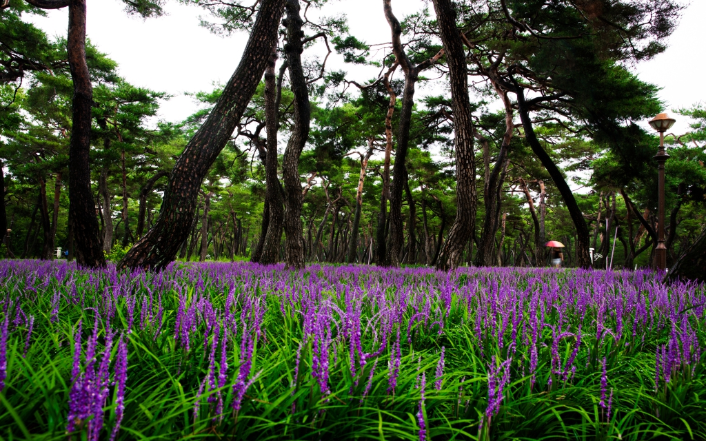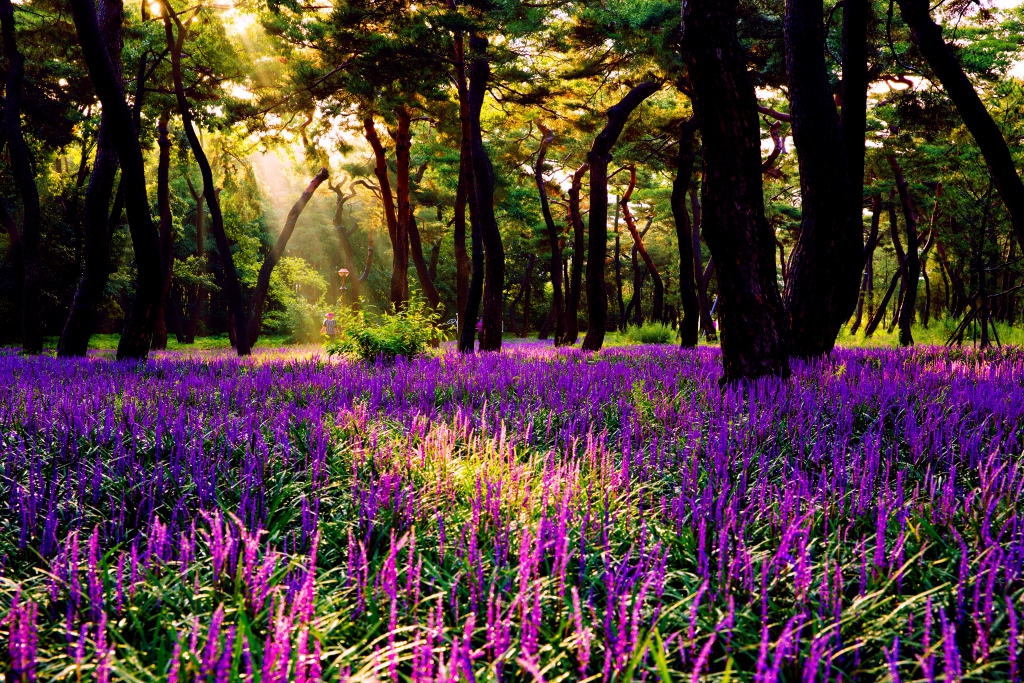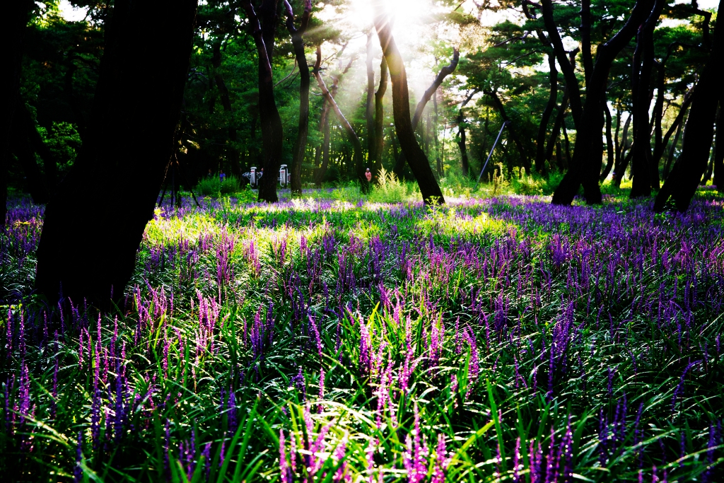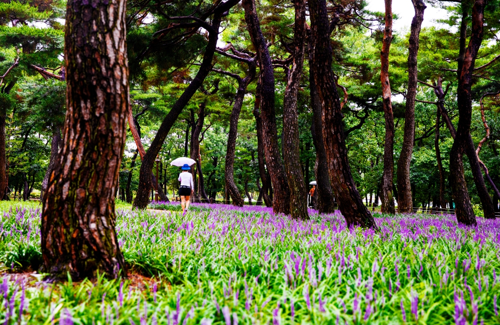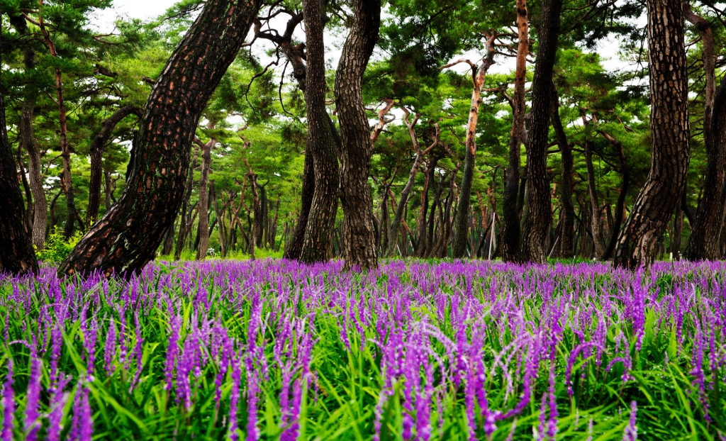 초록의 소나무숲과 보랏빛 맥문동숲과의 어우러짐이 환상적이네요.