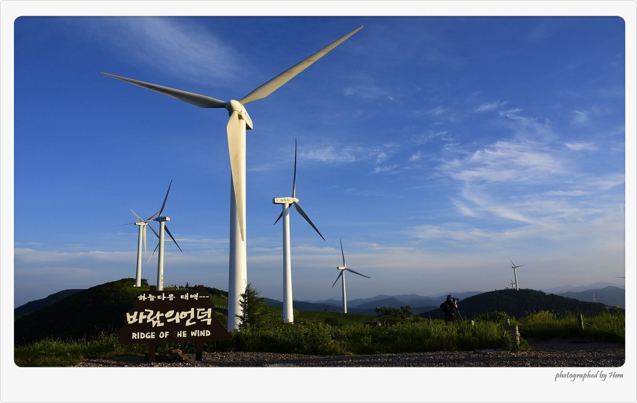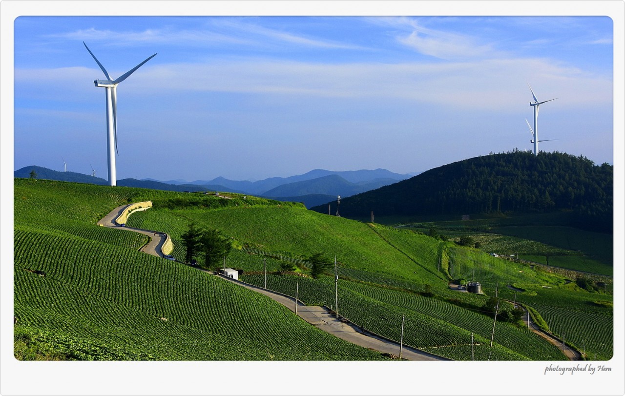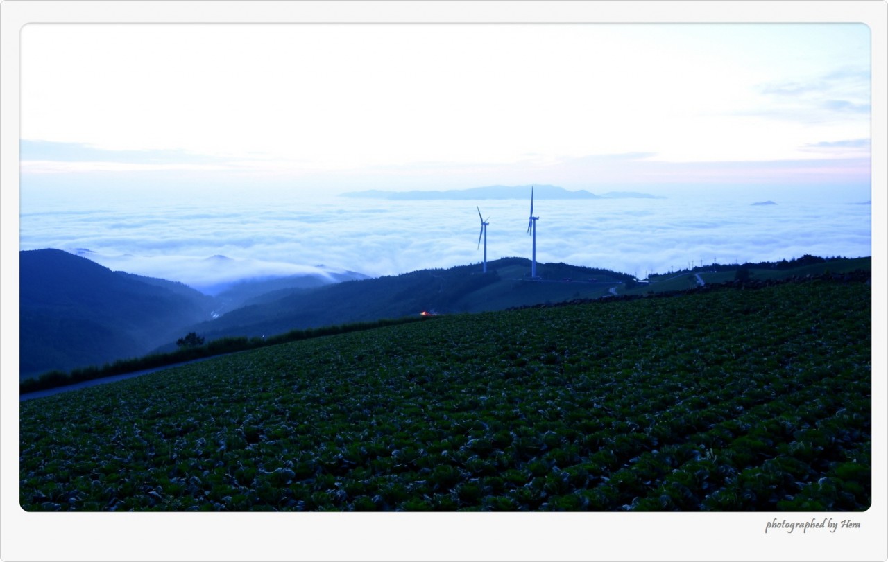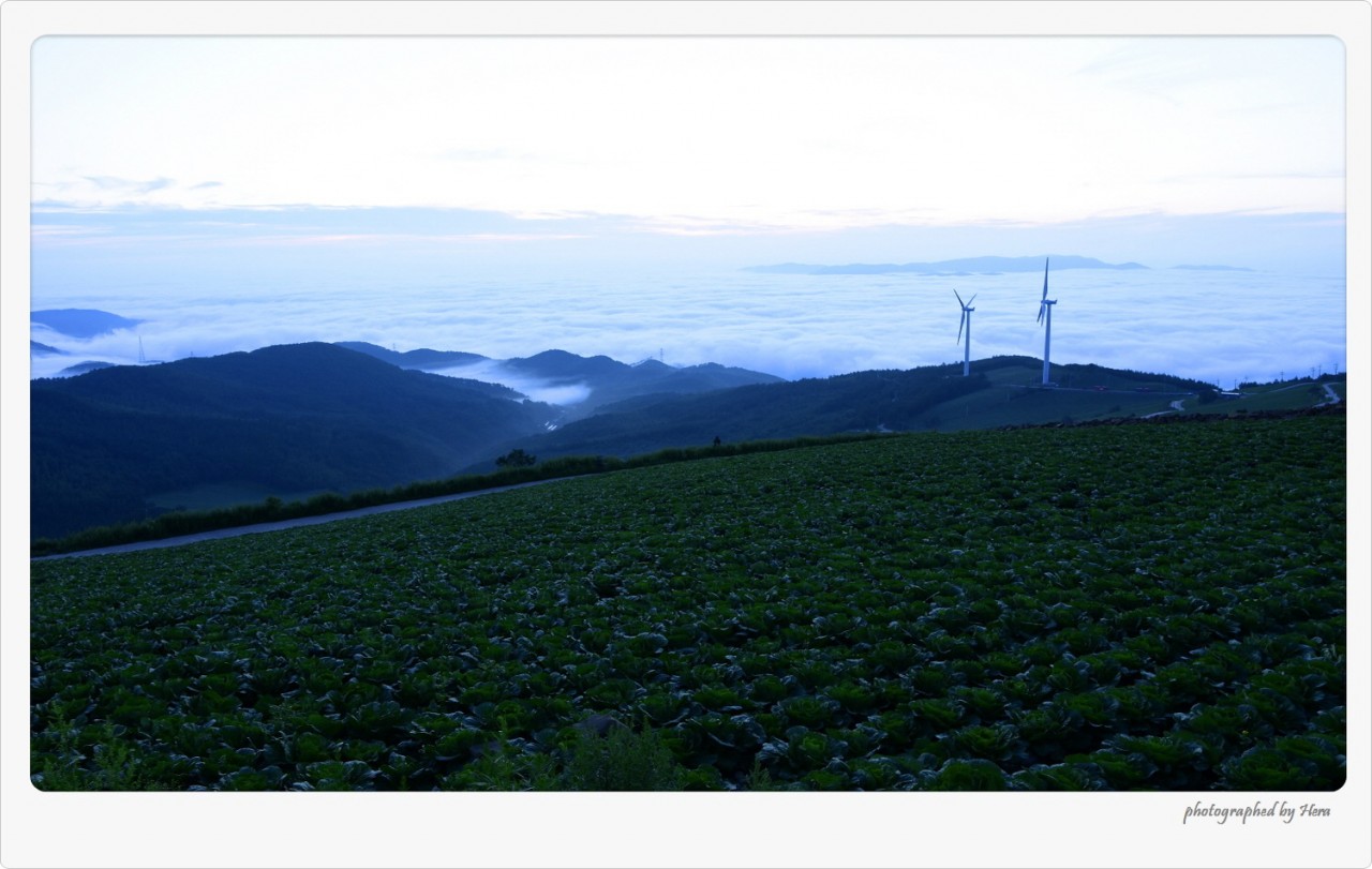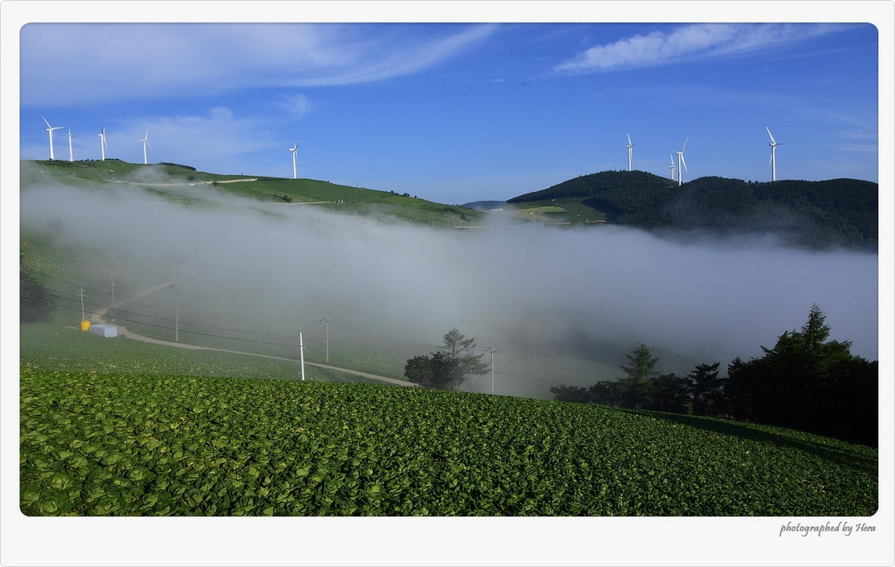 드넓은 고랭지배추밭과 풍력발전기와 푸른 하늘과 운해가 멋드러지게 어우러진,