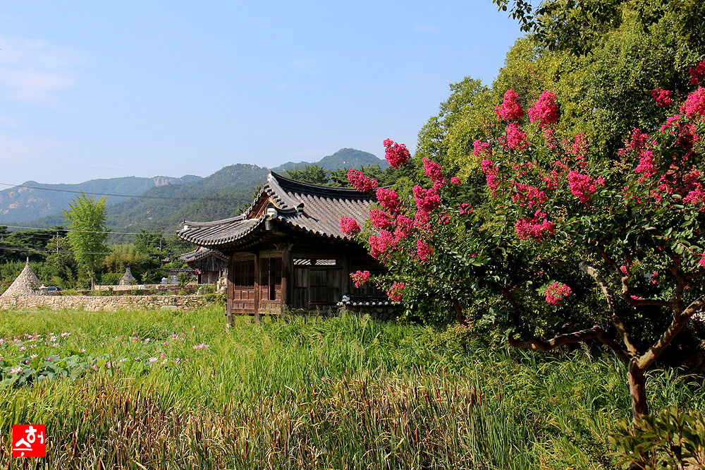 고풍스런 가옥에 거목사이로 보이는 저 연꽃이 배롱나무와함께