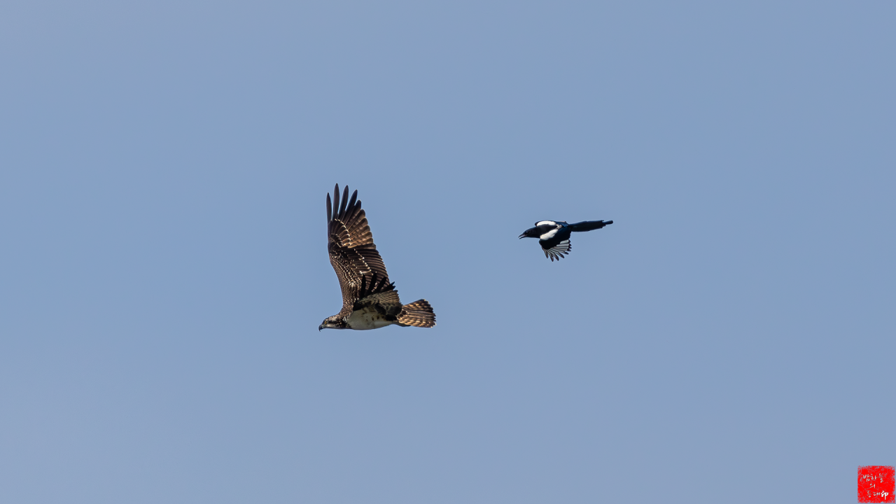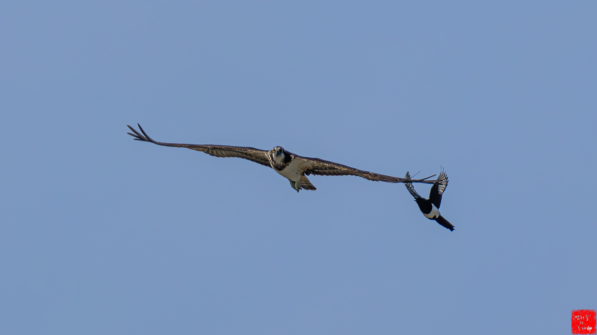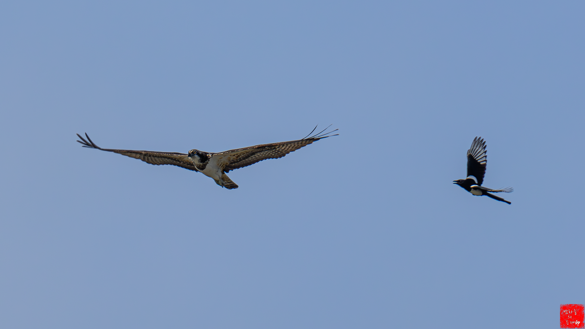 까치가 몰려있는 영역에 물수리가 들어오면 까치들이 텃세를 부립니다.