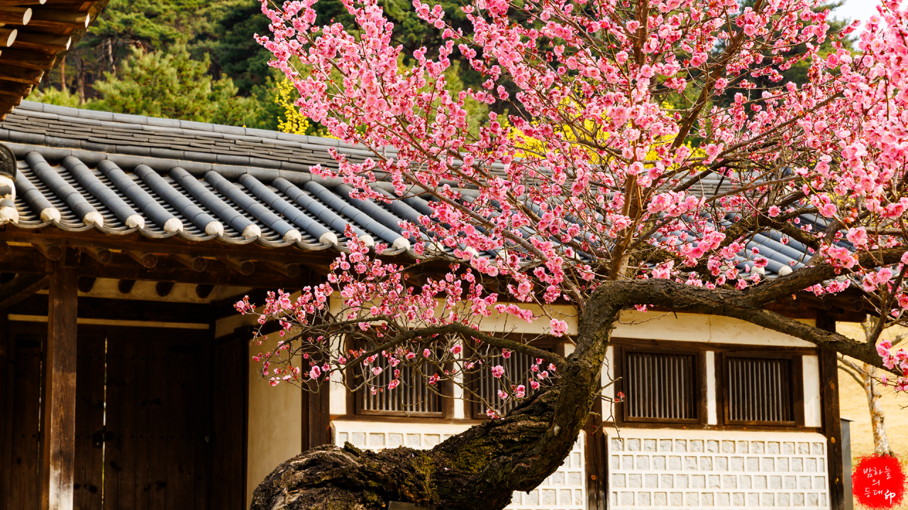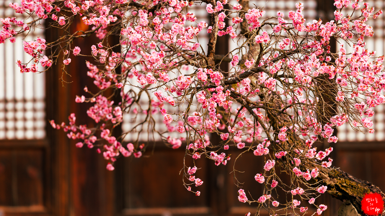이순신 장군이 사시던 고택의 창살과 고택을 배경으로 홍매화를 담는 구도를