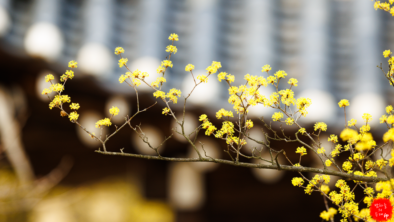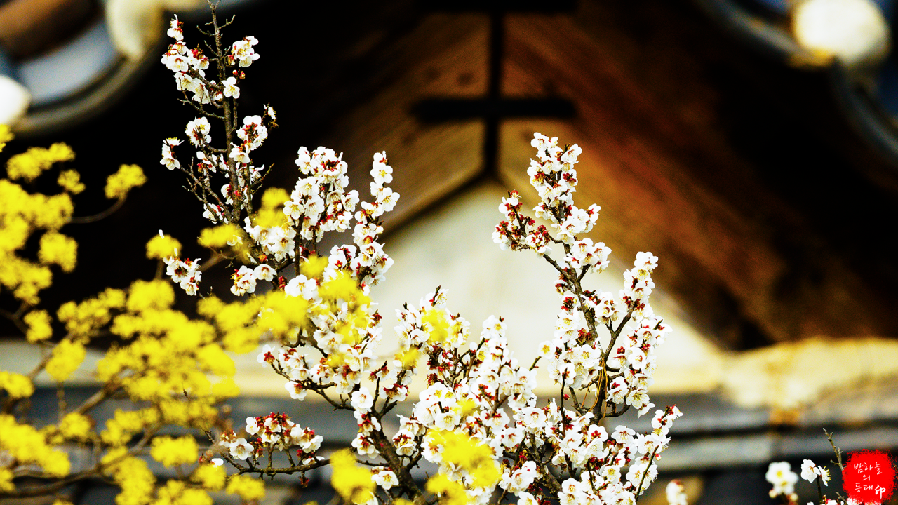"顯忠寺"뜰녘에 피어난 봄꽃,"紅梅花`산수유`진달래"香氣가 물씬..