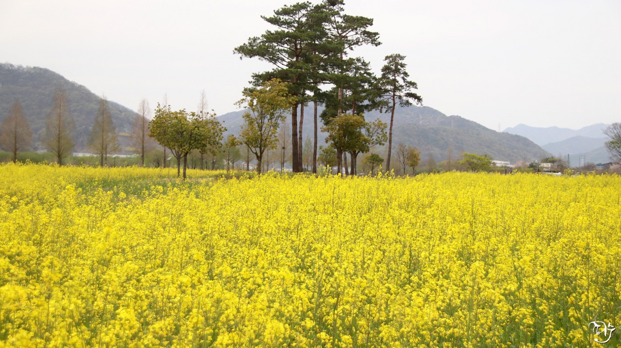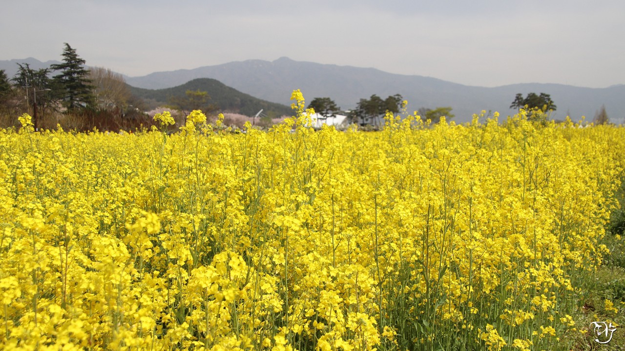 노란 유채꽃밭이 수채화를 보는 느낌이군요.