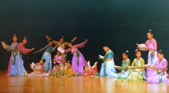 잠실 학생체육관에 초청되어 '선녀와 아이들' 한국창작무용을 선보이고 기념촬영을.. 장민정은 뒷편 가운데 작은 선녀이다.