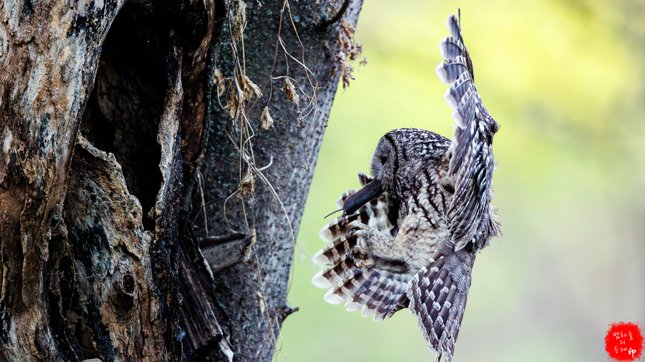 어미 올빼미가 쥐를 잡아 둥지 맞은편으로 날아들어왔다.