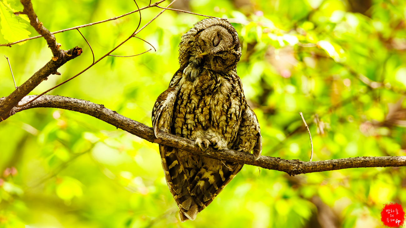 둥지 주변에서 새끼를 지키며 자고 있는 어미 올빼미와