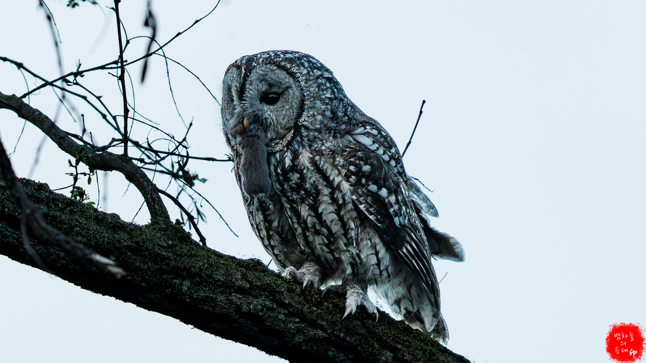 올빼미가 상당한 크기의 먹이를 입에 물었군요