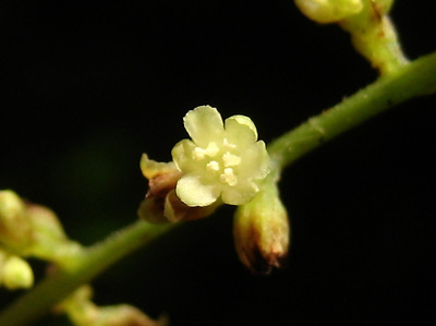 꽃은 단성화로 7∼8월에 담록색으로 피고 꽃줄기는