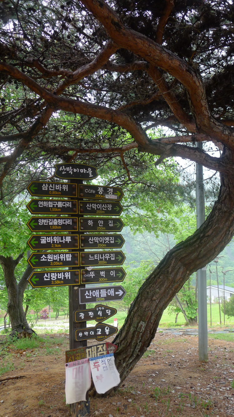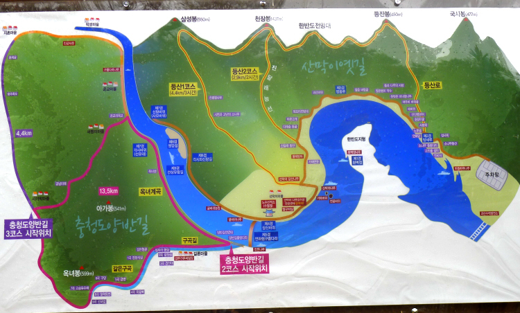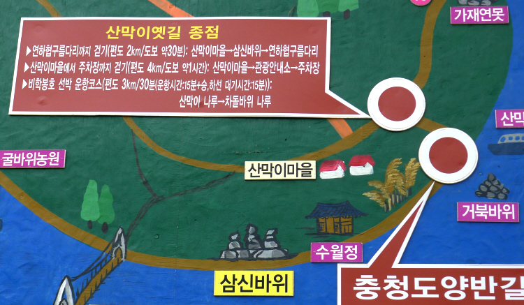 1) 산막이옛길 : 산 깊숙한 곳에 장막처럼 주변 산이 둘러쌓어 있다고 하여 산막이라 하며