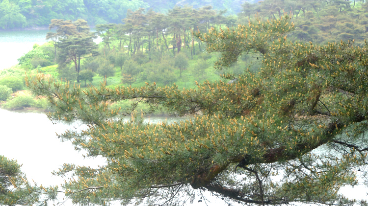 모양의 바위만 남게 됨. 백로가 푸른호수 위로 소나무에