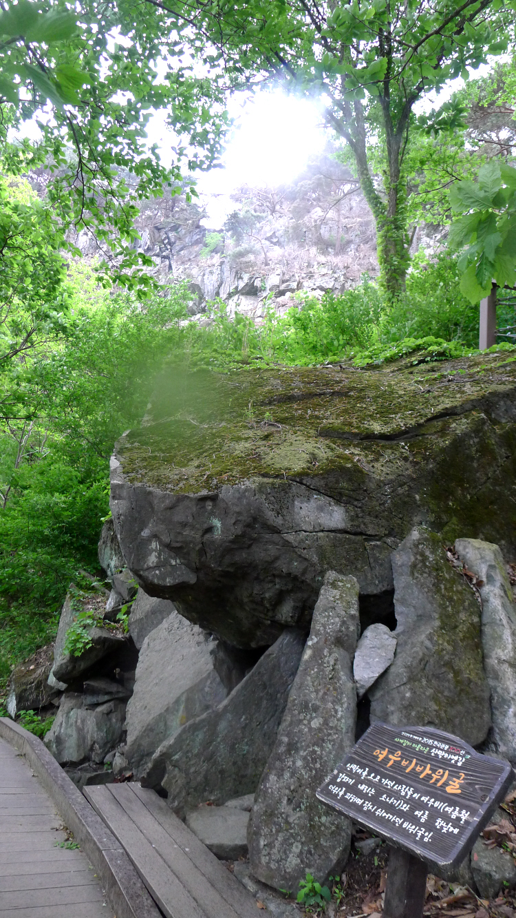 여우비바위굴 산막이를 오고 가던 사람들이 여우비(여름철 갑자기 내리는 소나기)와 여름철 한낮에 더위를 피하며 잠시 쉬어가던 바위굴임.