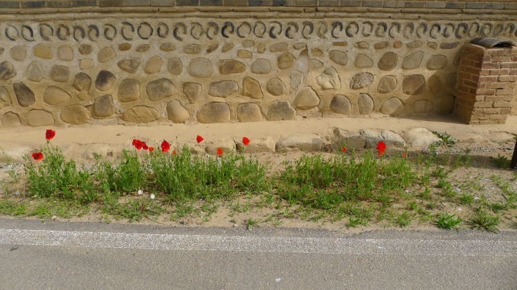 왼쪽으로 양귀비꽃 앞으로 하얀 민들레 두송이가 귀하게도 피어 있다.