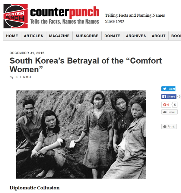 카운터펀치는 구랍 31일 ‘South Korea’s Betrayal of the “Comfort Women”-‘위안부’ 피해자 배신한 한국 정부’라는 제목의 기사에서 위안부 문제 해결에 대한 배경과 실상에 대해 광범위하고 정확하게 보도해 큰 파장을 불러일으켰다.